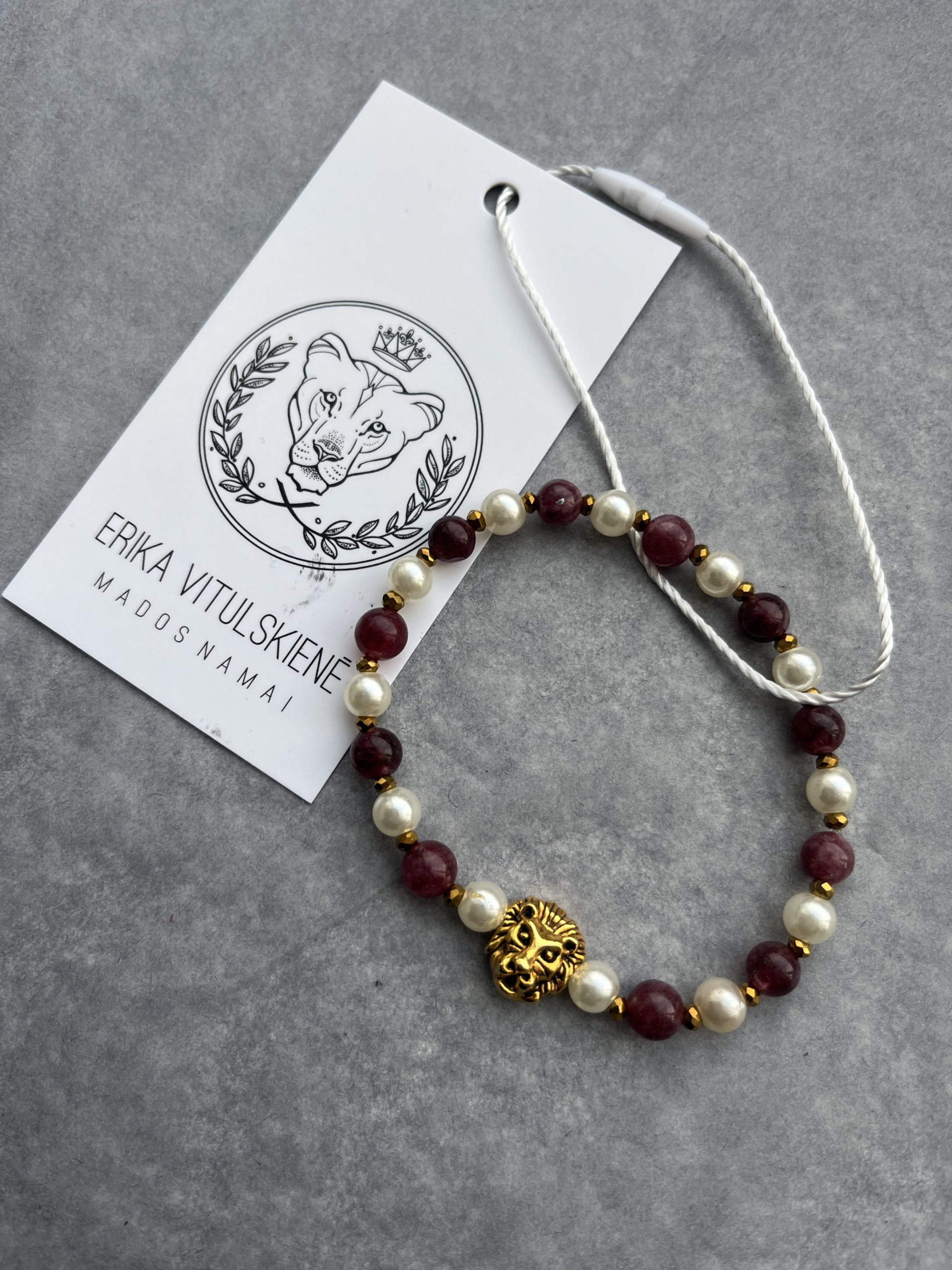 Ši apyrankė spinduliuoja kilnumą, brandą ir vidinę jėgą. Bordo spalvos akmenys kuria gilų, šiltą foną, perlų imitacija suteikia švelnios elegancijos, o aukso spalvos liūto galva tampa ryškiu pasitikėjimo ir lyderystės simboliu. Tai papuošalas tiems, kurie renkasi tvirtą, bet rafinuotą stilių.