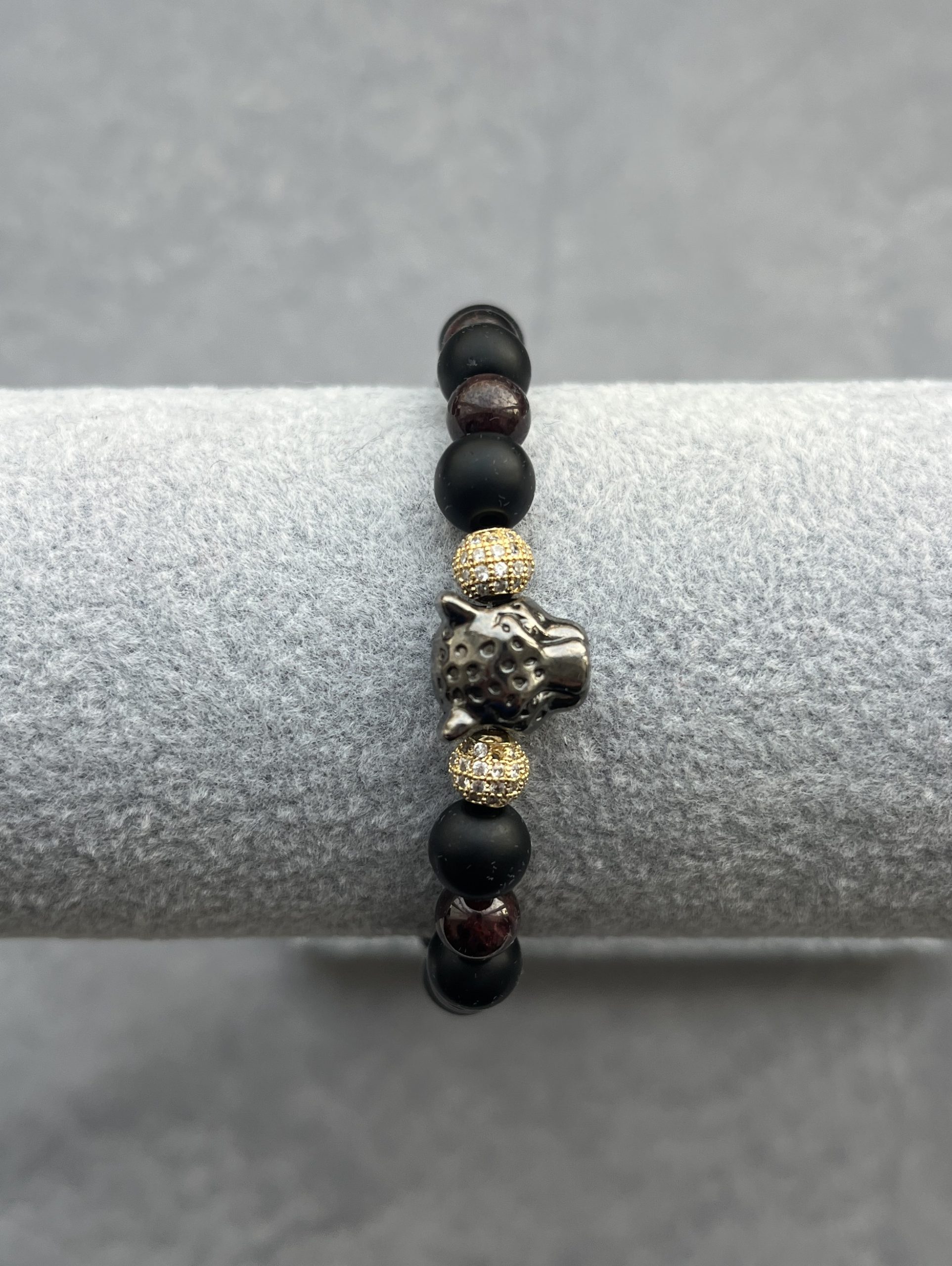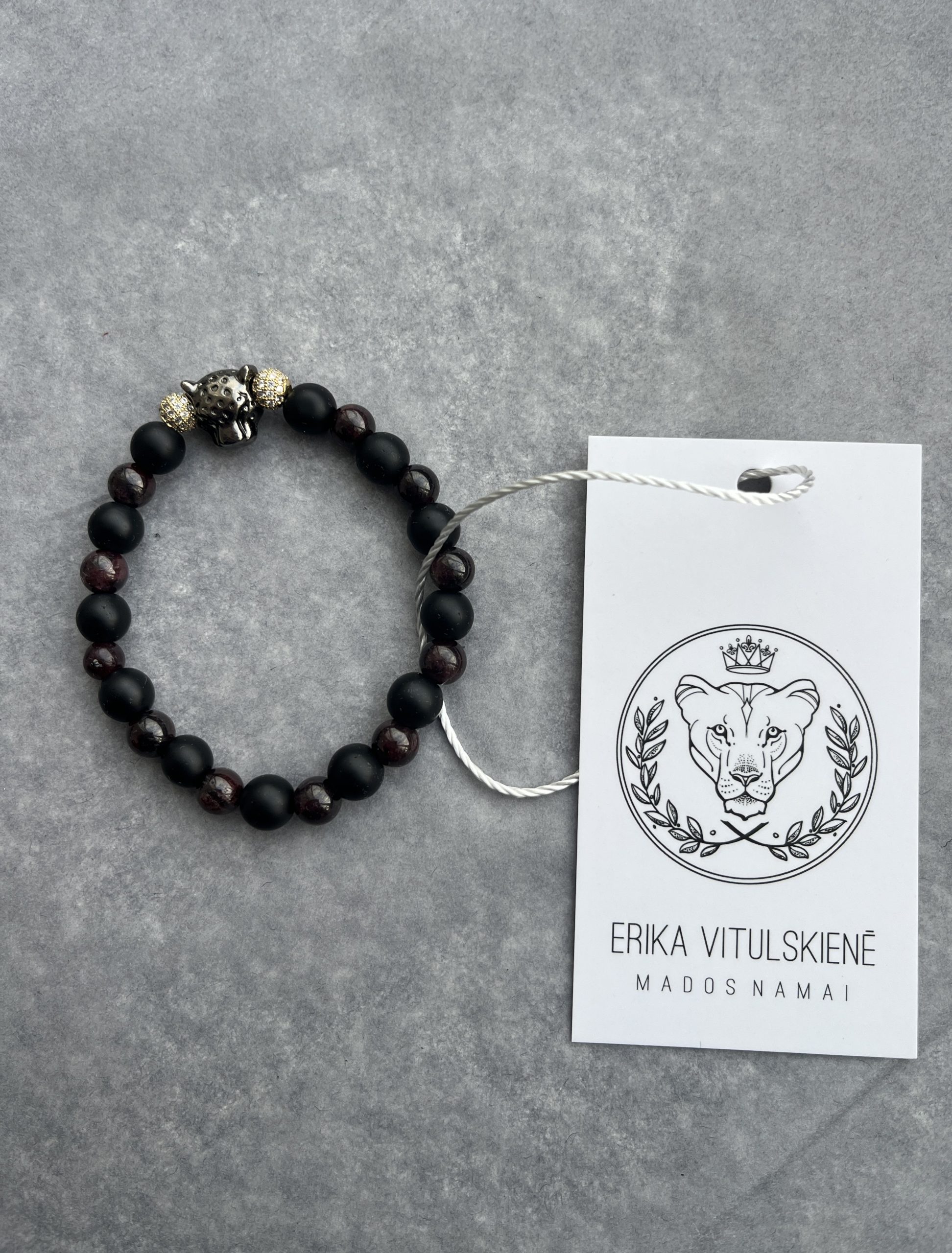 Juodo akmens apyrankė su leopardo siluetu ir granato intarpais