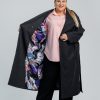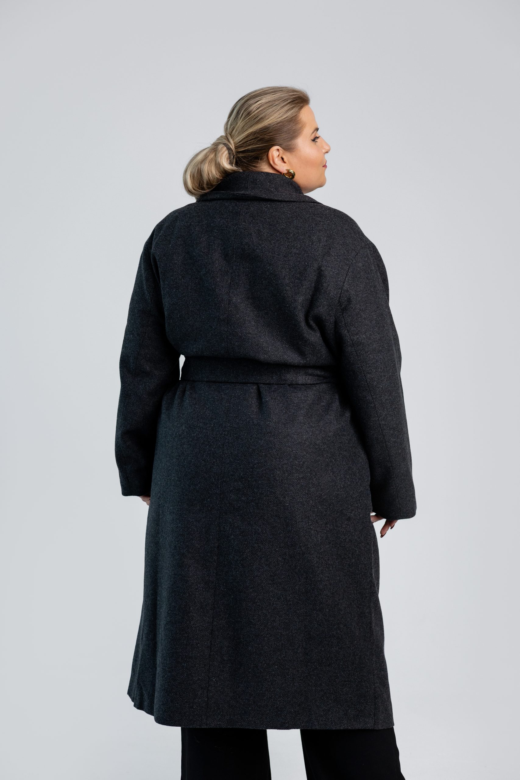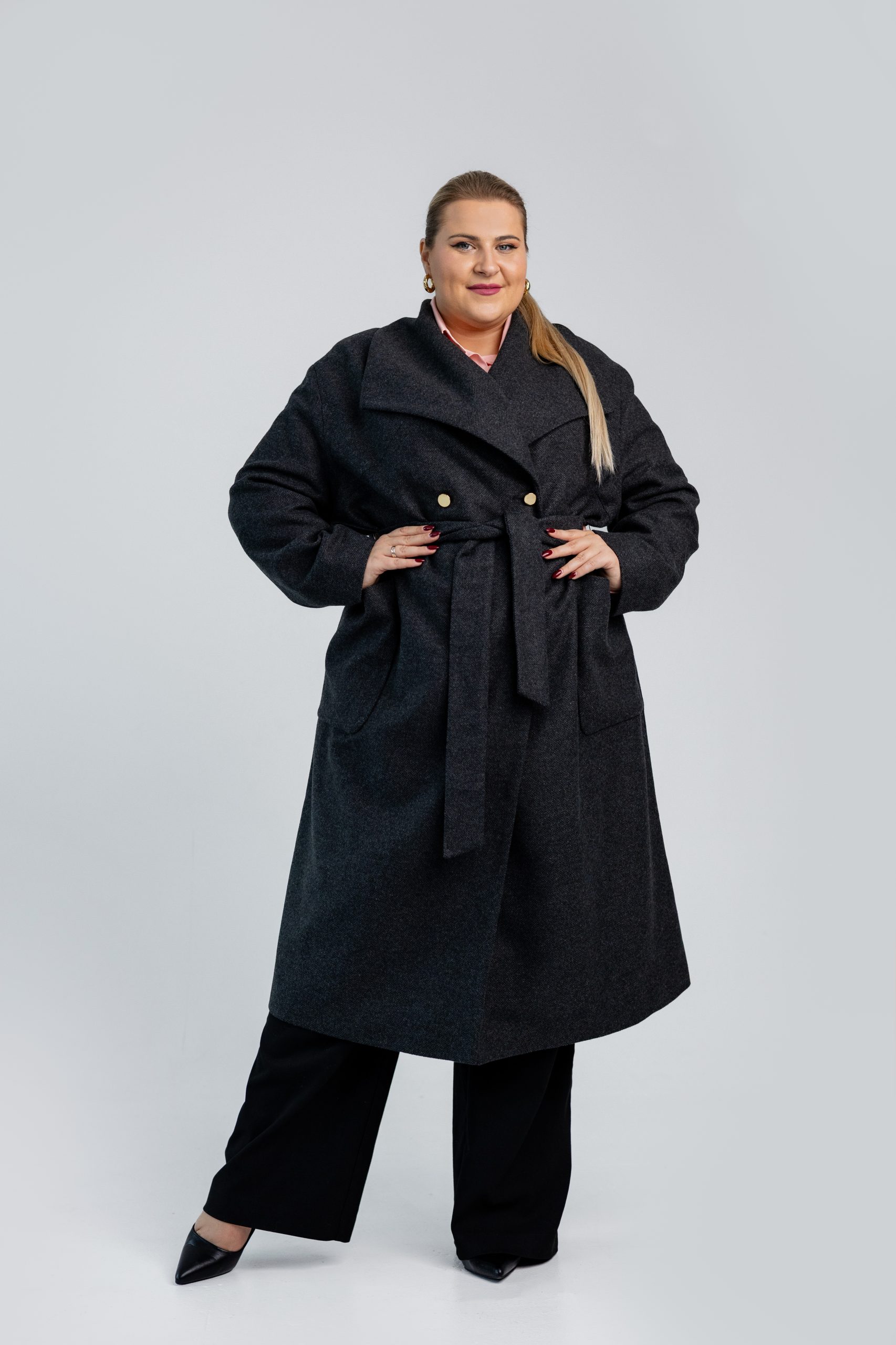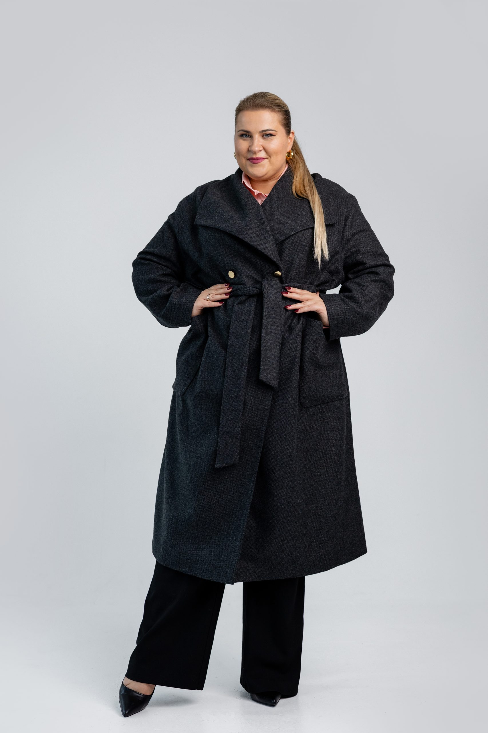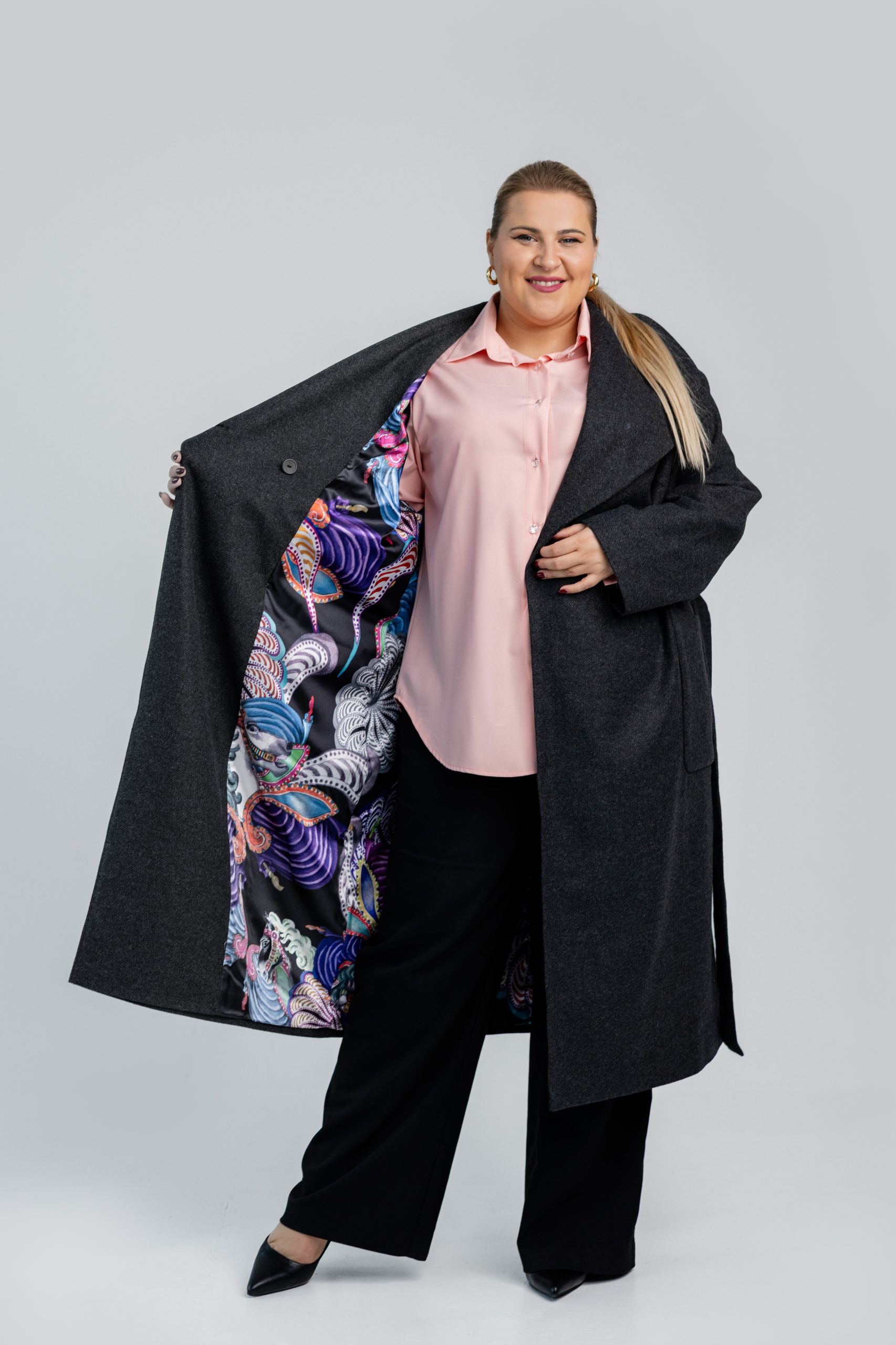 Klasikinis, tamsiai pilkas paltas, kuris sujungia eleganciją, kokybę ir patogumą. Audinio sudėtis – 35 % vilna, 15 % kašmyras, 45 % poliesteris ir 5 % elastanas – užtikrina šilumą, minkštumą ir ilgaamžiškumą. Paltas turi ypatingai džiaugsmingą, spalvingą pamušalą, suteikiantį vidinės prabangos pojūtį. Auksinės sagos ir diržas pabrėžia išskirtinį dizainą – jį galima dėvėti tiek sujuostą, tiek laisvai, priklausomai nuo norimo stiliaus. Puikiai tinka rudens orams ar net šiltai žiemai.