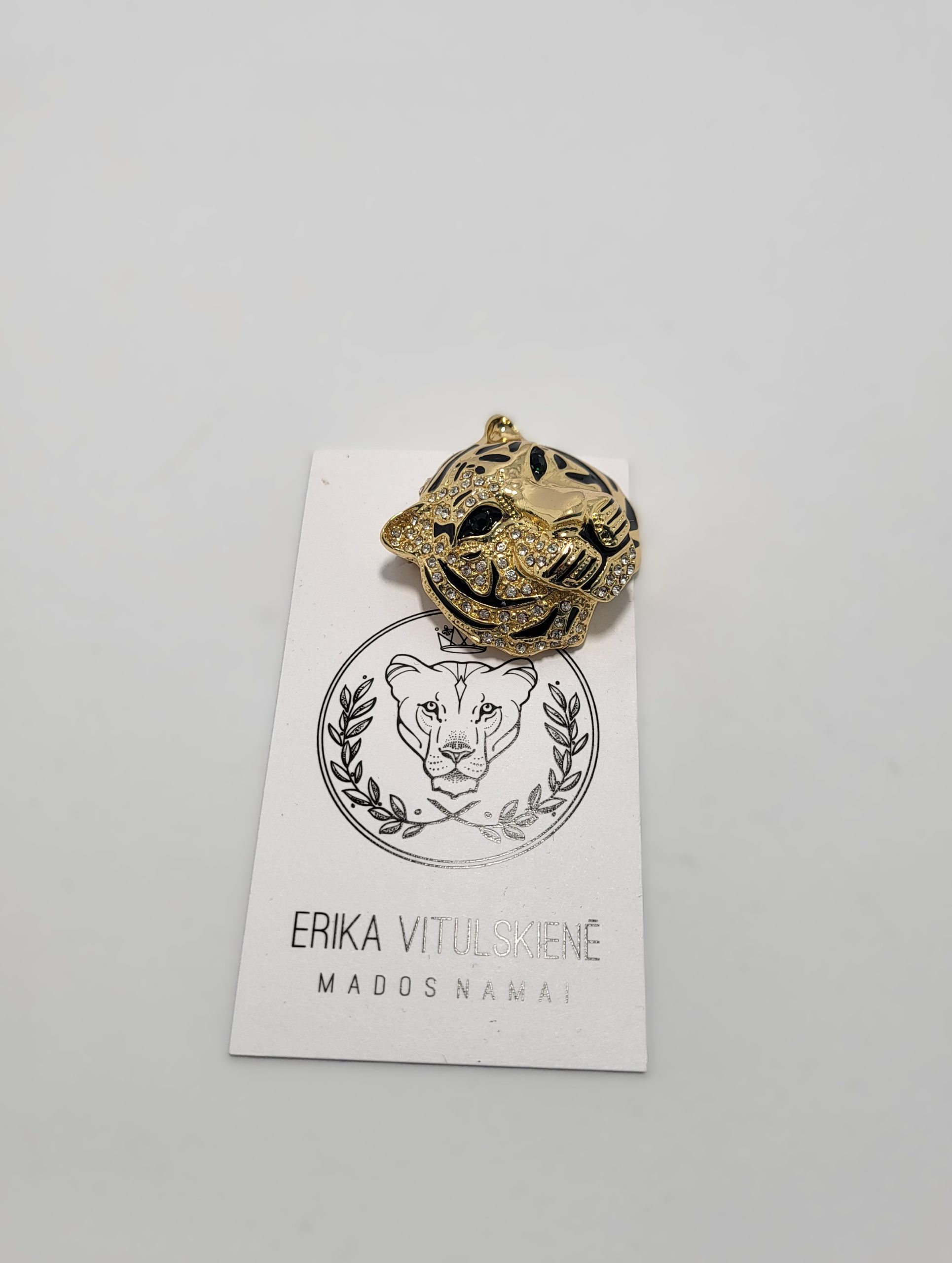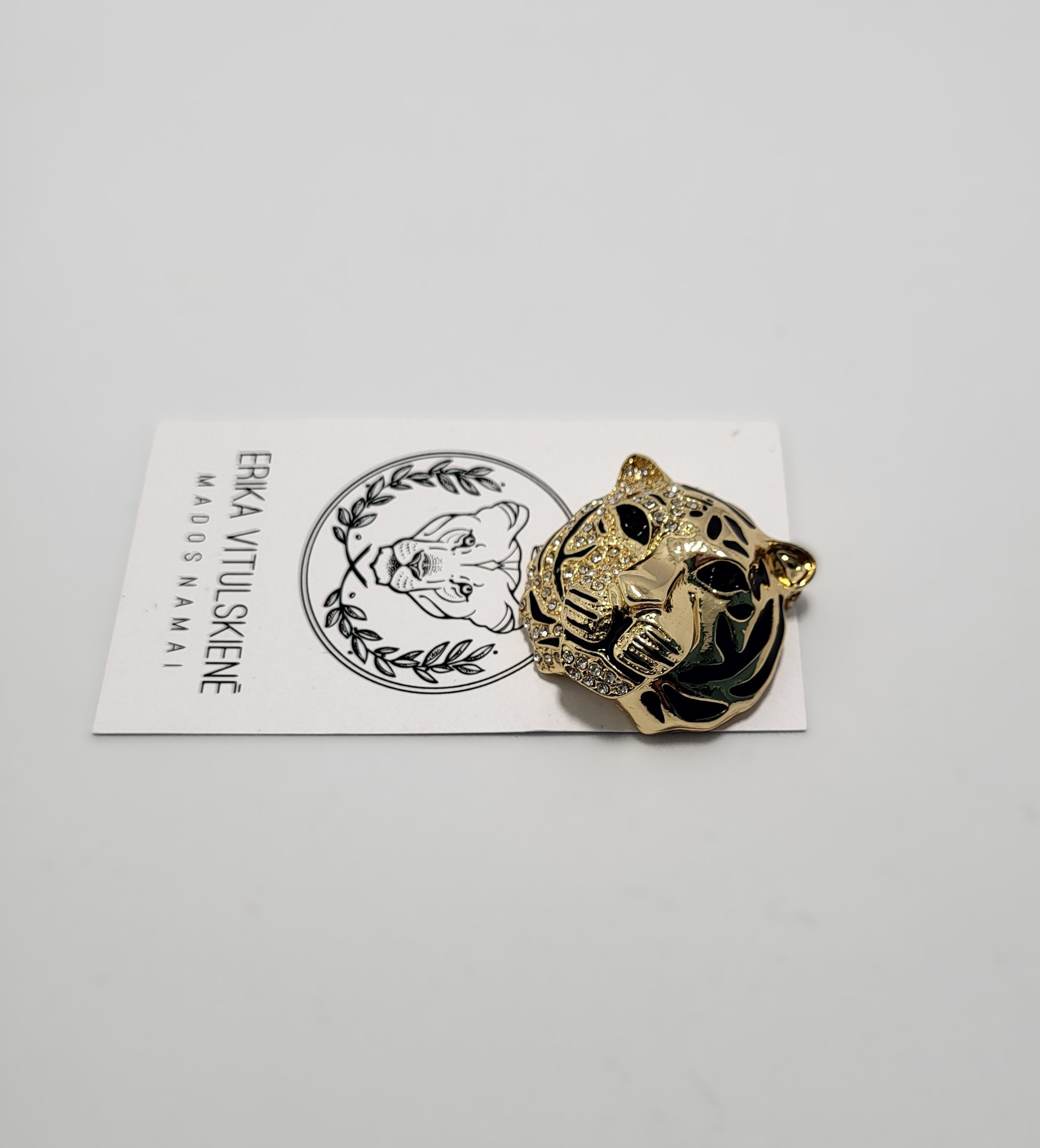 Prabangiai žvilganti tigro galvos segė – stilingas akcentas, suteikiantis įvaizdžiui stiprybės ir elegancijos.