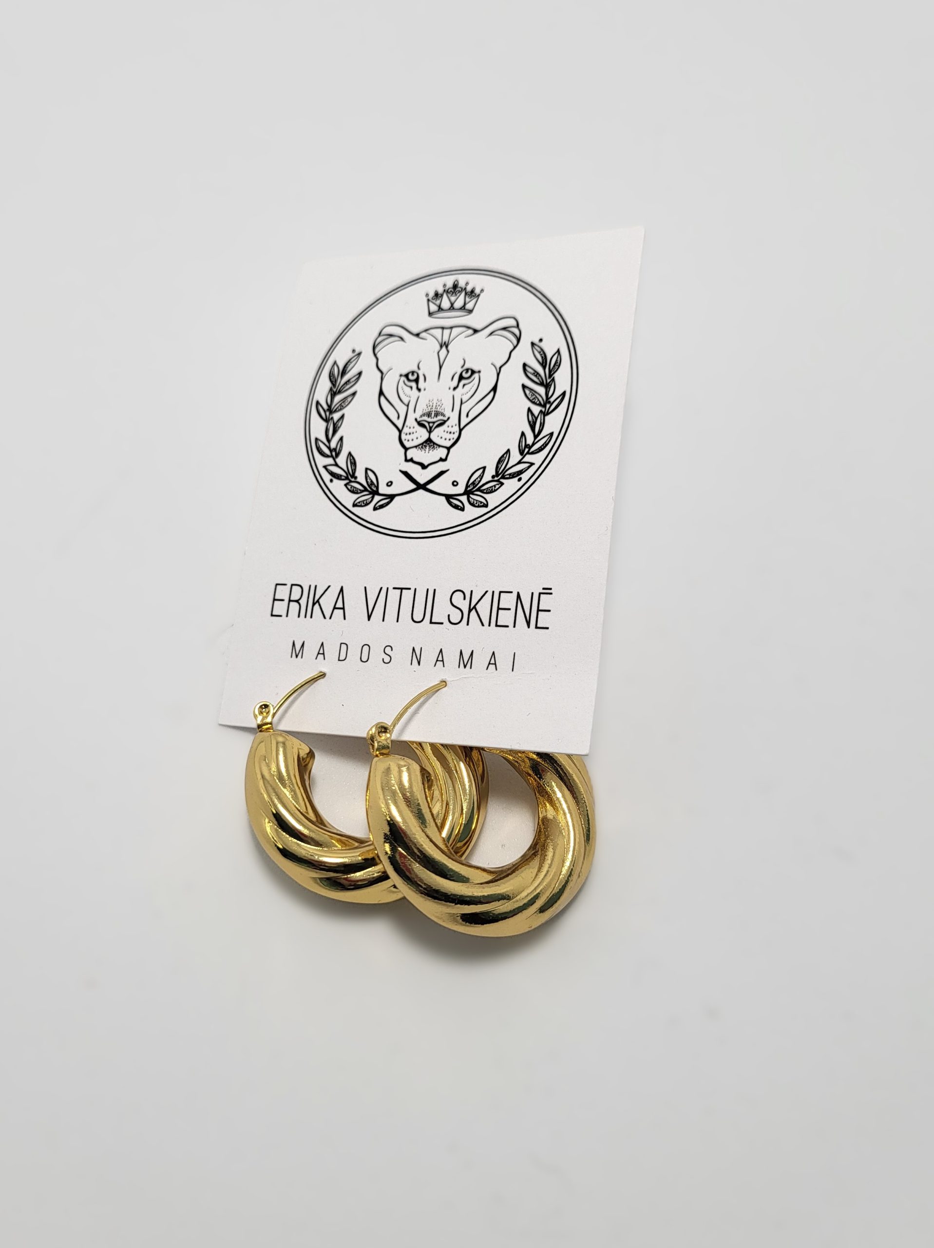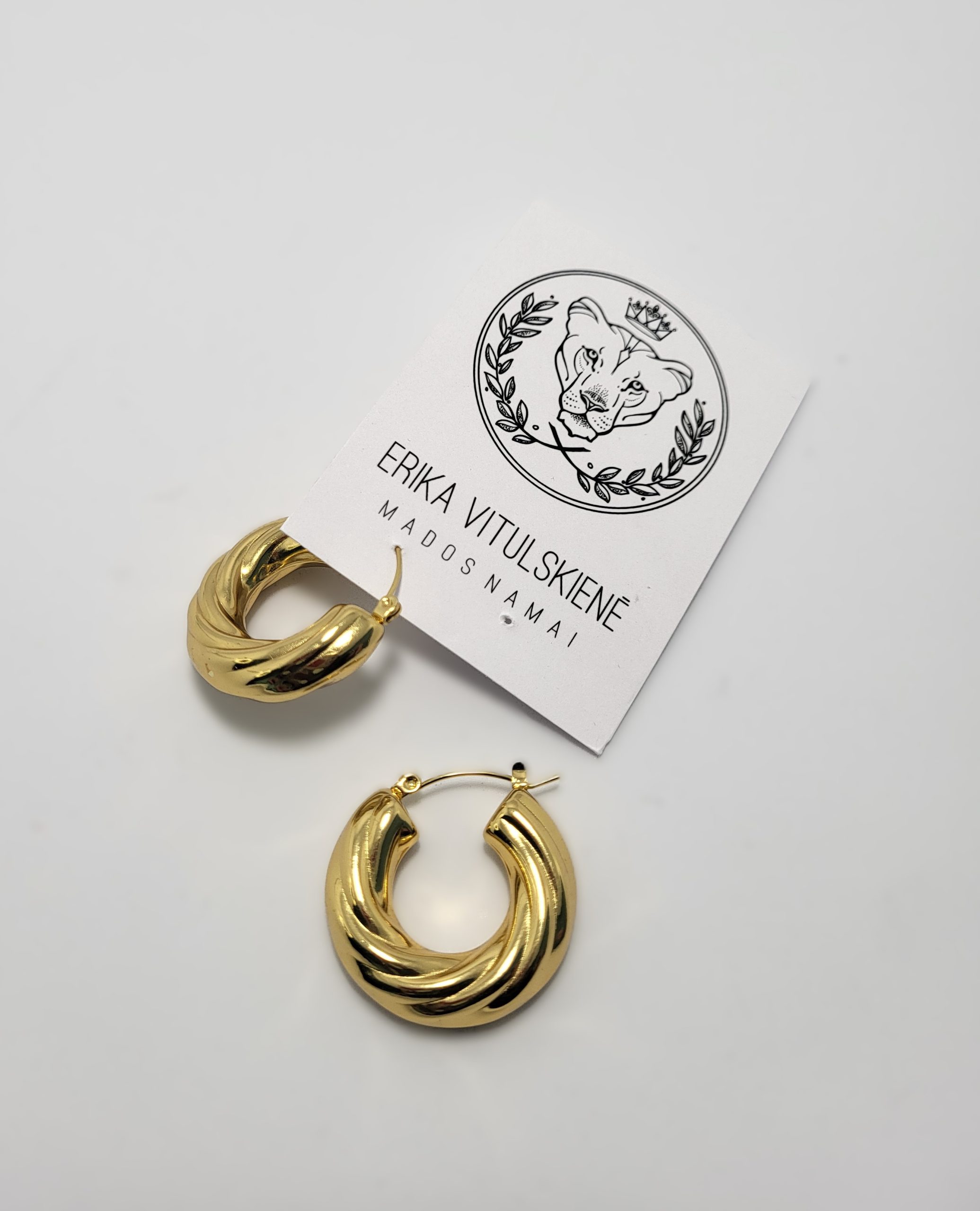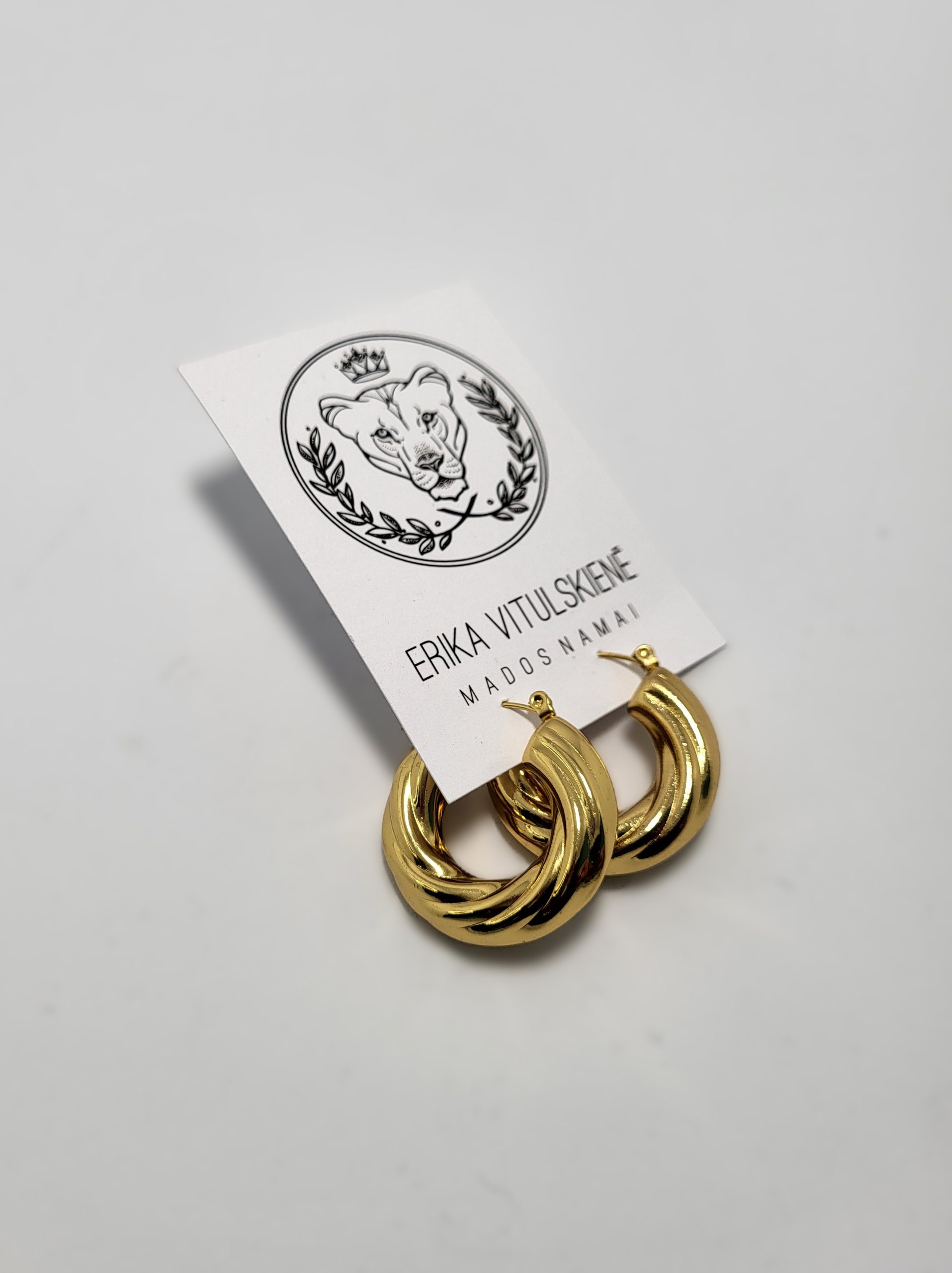 Auksinės spalvos, įmantriai susukti lankelio tipo auskarai, suteikiantys išskirtinumo ir prabangos pojūtį. Tai universalus akcentas, kuris papuoš tiek kasdienį įvaizdį, tiek vakarinę aprangą.